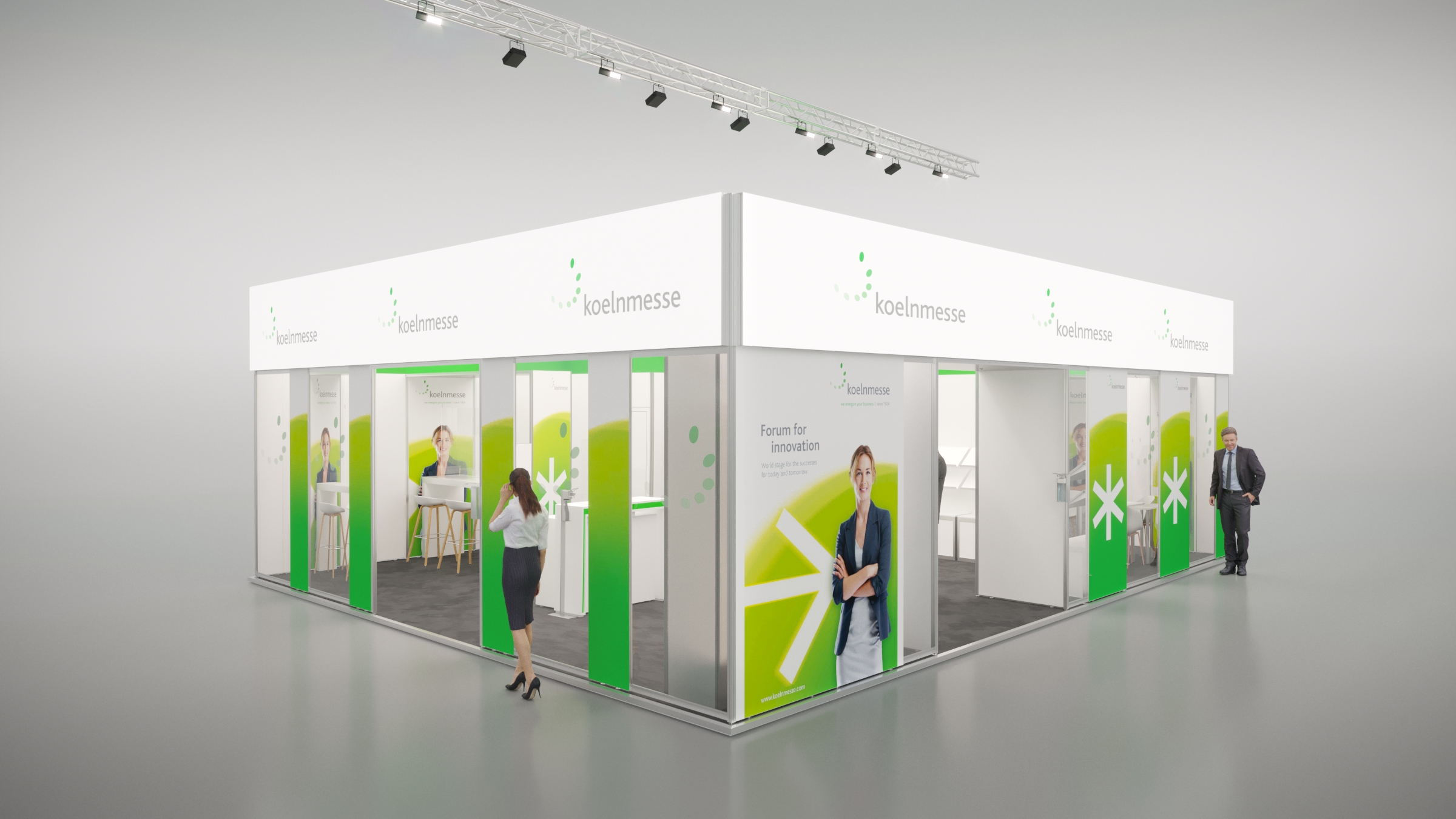Die Preisangaben beziehen sich immer auf einen B10 x T8 = 80 m² Eckstand. Andere Standgrößen und Standformen (Reihenstand, Kopfstand, Blockstand) sind modular adaptierbar und kalkulieren wir nach Ihrem Briefing gerne individuell für Sie.