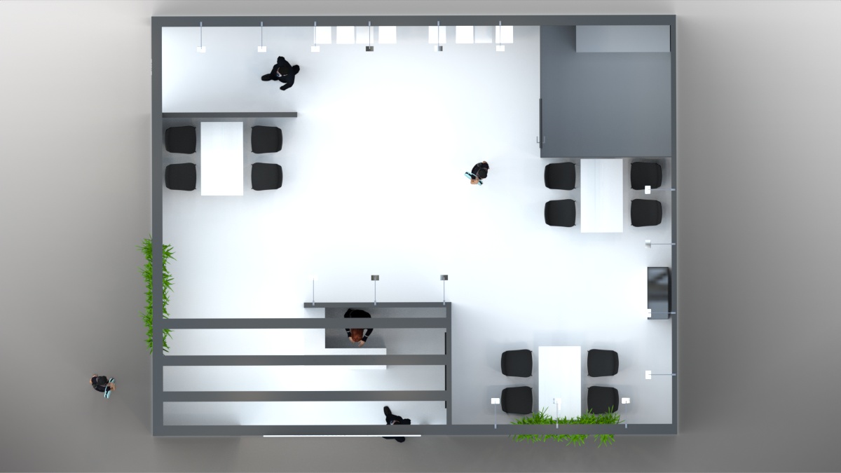 - Empfangstheke und Sitztischgruppen mit Spuckschutz
