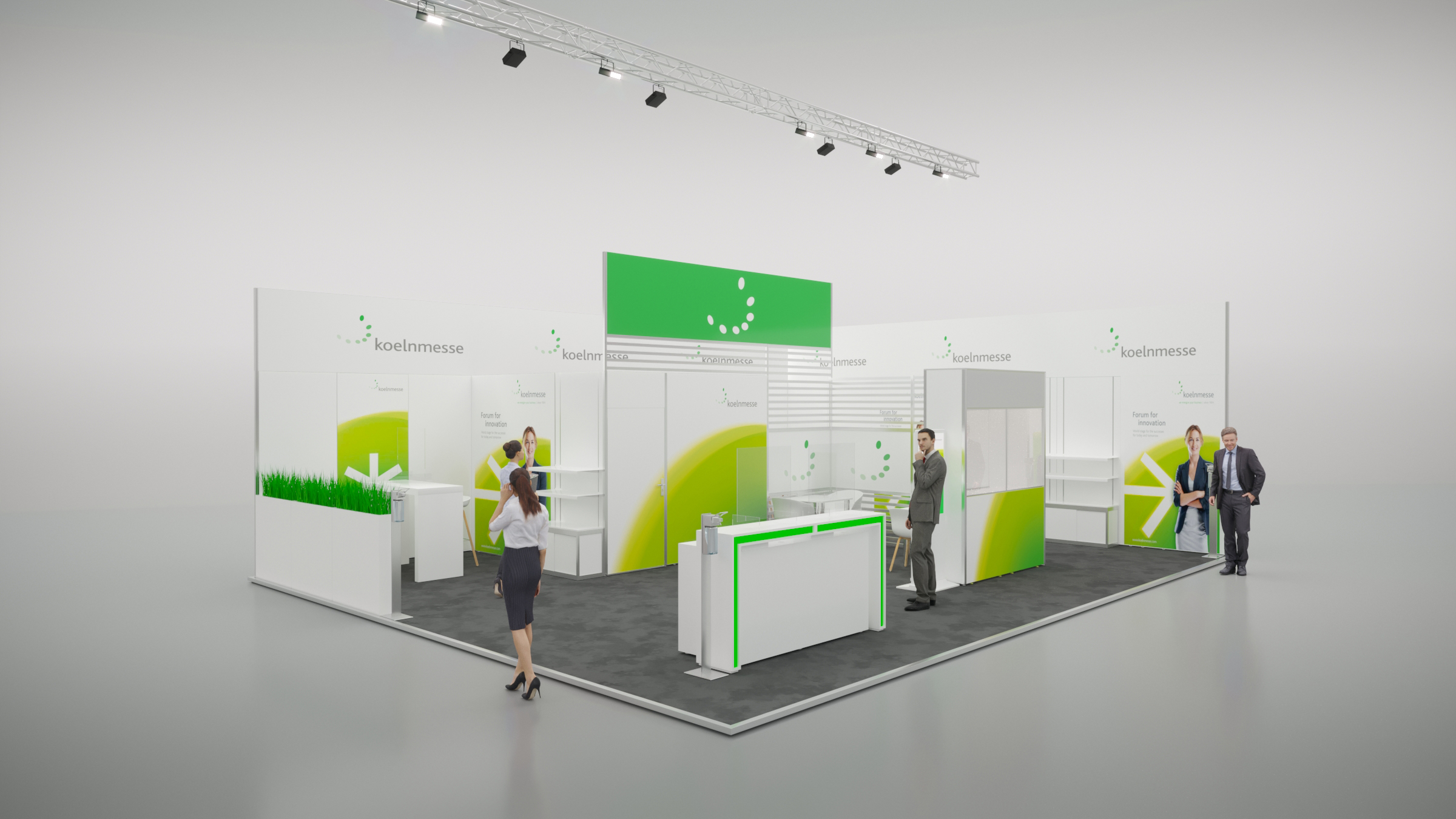 Die Preisangaben beziehen sich immer auf einen B10 x T8 = 80 m² Eckstand. Andere Standgrößen und Standformen (Reihenstand, Kopfstand, Blockstand) sind modular adaptierbar und kalkulieren wir nach Ihrem Briefing gerne individuell für Sie.